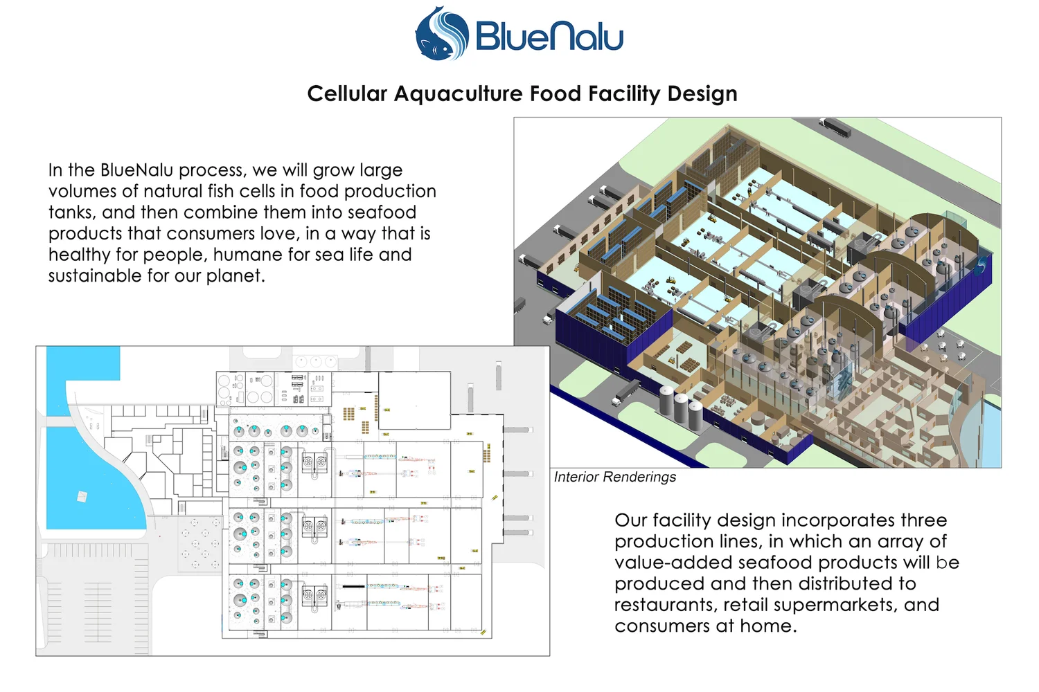 “Over the past year, we have engaged with bioprocessing and food engineering specialists, as well as architects that specialize in food facility design and construction, to determine the optimal process flow and the underlying assumptions that will result in maximum production capacity and flexibility, and minimal capital and operational costs. As can be seen from our schematics, each production facility will look like a hybrid between a microbrewery and a conventional food production facility. BlueNalu’s food facilities will produce an array of raw and cooked, fresh and frozen seafood products that are prepared in a trusted and familiar way,” said Cooperhouse.